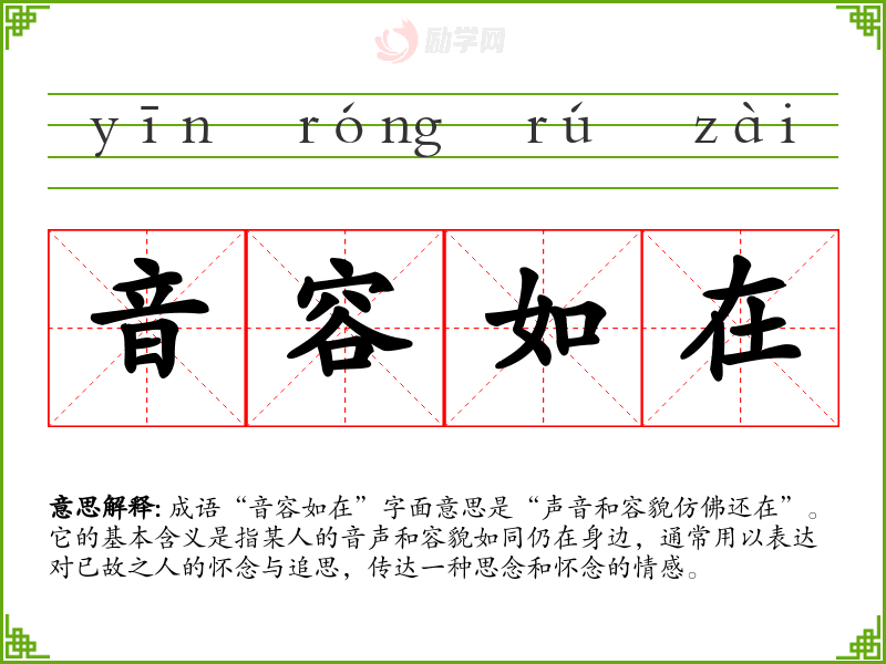 成语“音容如在”字面意思是“声音和容貌仿佛还在”。它的基本含义是指某人的音声和容貌如同仍在身边,通常用以表达对已故之人的怀念与追思,传达一种思念和怀念的情感。