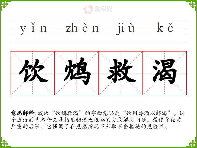 通过对“饮鸩救渴”的学*,我更加意识到在面对问题时保持冷静和理智的重要性。这不仅对我的语言表达有帮助,也让我在生活中更好地做出选择和决策。这个成语不仅是一种警示,更是一种智慧的体现,值得在日常生活中时刻铭记。