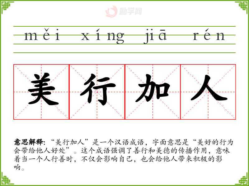 “美行加人”是一个汉语成语,字面意思是“美好的行为会带给他人好处”。这个成语强调了善行和美德的传播作用,意味着当一个人行善时,不仅会影响自己,也会给他人带来积极的影响。