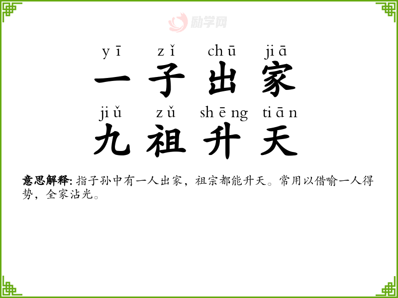 《儒林外史》第二十回:“一子出家,九祖升天。”意指一个子孙出家修行,能使九代祖先的灵魂得到超度升天。