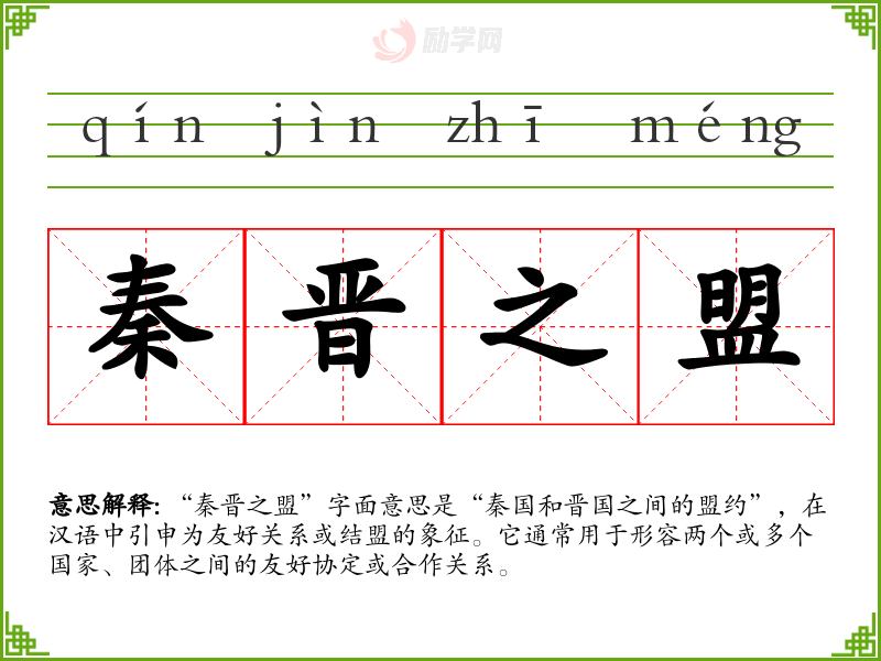 “秦晋之盟”字面意思是“秦国和晋国之间的盟约”,在汉语中引申为友好关系或结盟的象征。它通常用于形容两个或多个国家、团体之间的友好协定或合作关系。