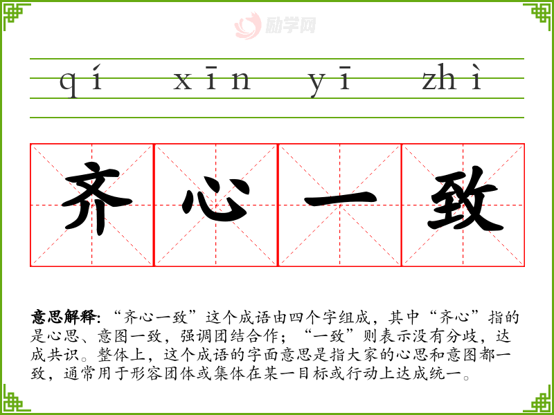 通过对“齐心一致”的分析,我认识到团结的力量无处不在,它不仅在语言表达中具有重要地位,更在我们的生活中起到积极的作用。这个成语鼓励我在学*和工作中更加注重团队合作与集体力量。