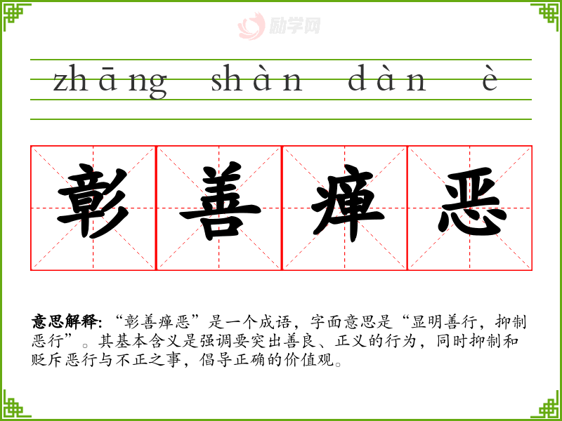 - 反义成语:助长恶势、纵容邪恶。反映了与“彰善瘅恶”相对的消极行为和态度。