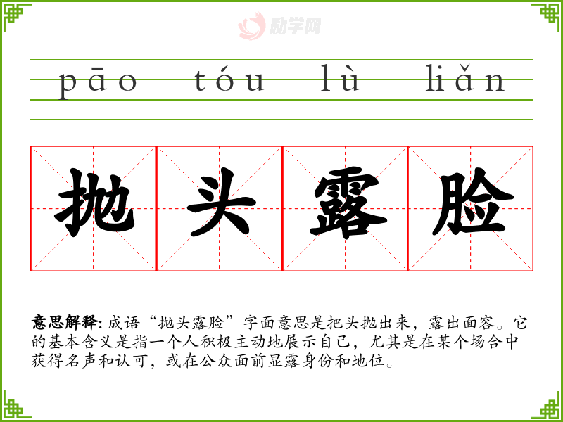 成语“抛头露脸”字面意思是把头抛出来,露出面容。它的基本含义是指一个人积极主动地展示自己,尤其是在某个场合中获得名声和认可,或在公众面前显露身份和地位。