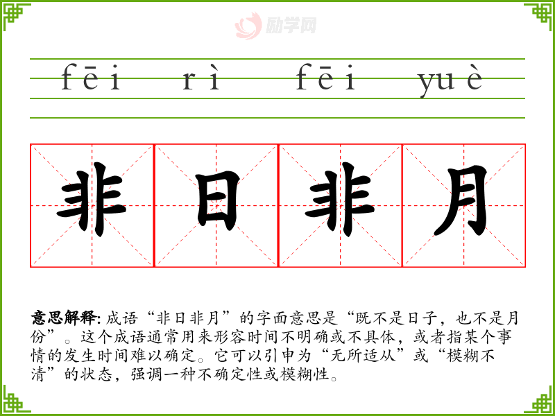 成语“非日非月”的字面意思是“既不是日子,也不是月份”。这个成语通常用来形容时间不明确或不具体,或者指某个事情的发生时间难以确定。它可以引申为“无所适从”或“模糊不清”的状态,强调一种不确定性或模糊性。