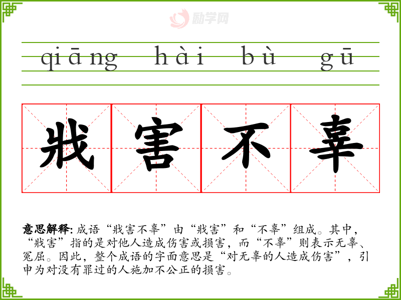 在特定文化或社会背景中,“戕害不辜”体现了对正义与人道的追求。特别是在法律与道德的交织中,这个成语提醒人们应关注无辜者的权益。在现代社会,随着人权意识的增强,这一成语的适用性更加广泛,成为呼吁正义、保护弱者的重要表达。